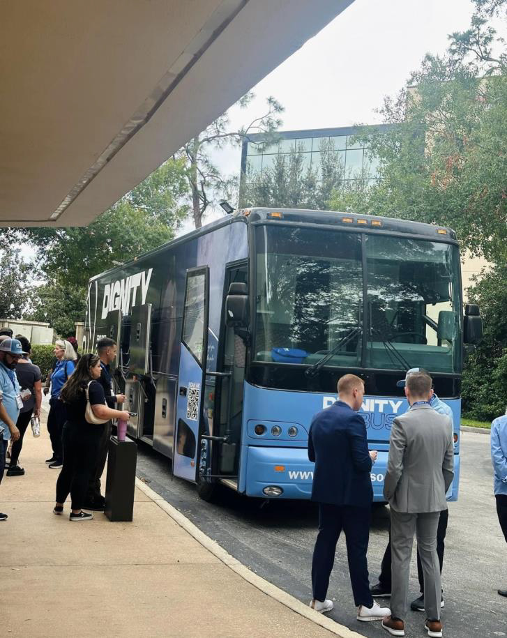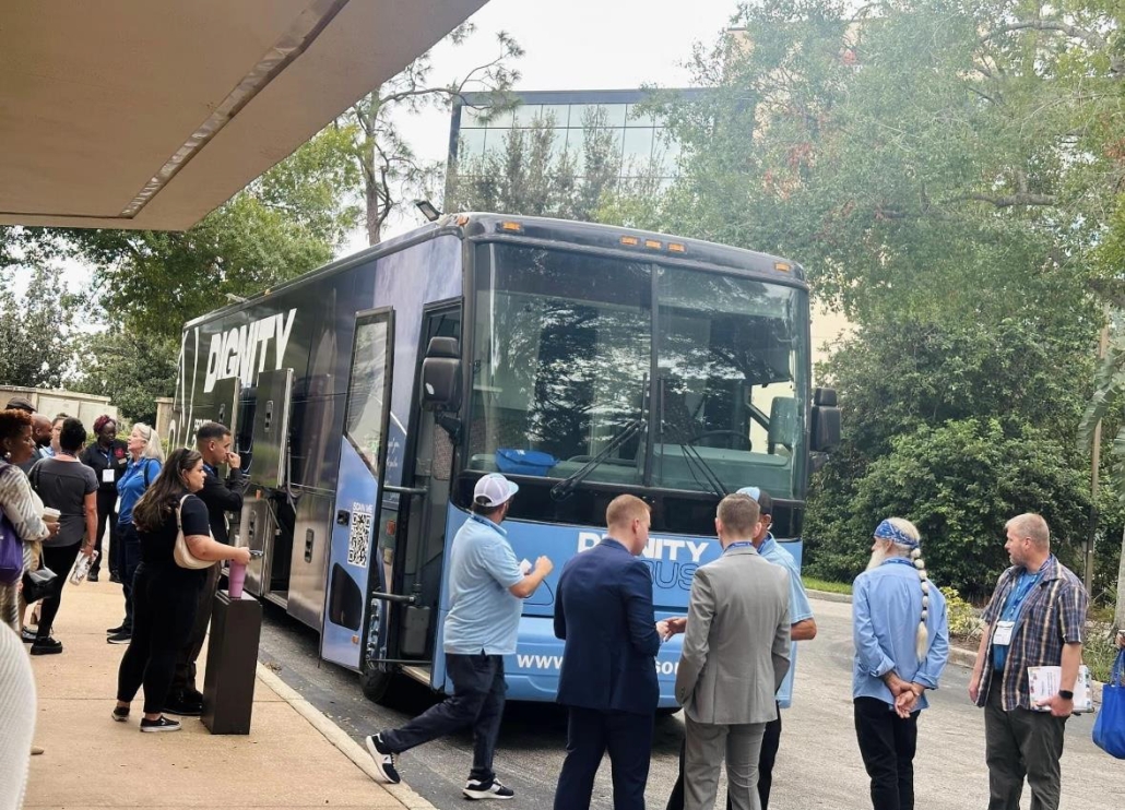 Each voice brought a unique perspective, creating a tapestry of hope and determination that resonated deeply with our audience. Attendees from all walks of life filled the room, and their engaged presence reminded us that this fight is not ours alone—it is a global mission. After the presentation, a line formed out the door as attendees eagerly awaited their turn to tour a Dignity Bus. Our innovative mobile shelter, designed to provide safe, overnight housing for the homeless, was a showstopper.